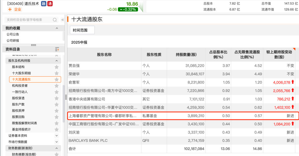 比如,二季度银叶投资新进浩欧博前十大股东名单,睿郡资产新进道氏技术(300409)前十大流通股东名单等。公开资料显示,浩欧博专注于体外诊断领域中的过敏和自身免疫疾病诊断试剂的研发和生产,道氏技术则聚焦新材料业务,目前以新能源材料业务为核心战略业务。