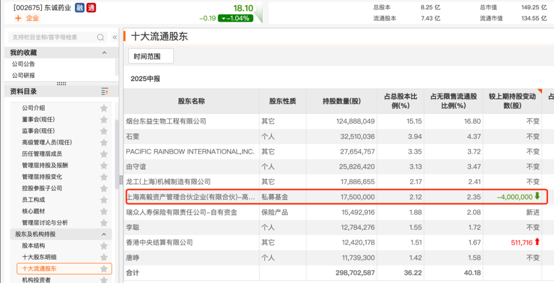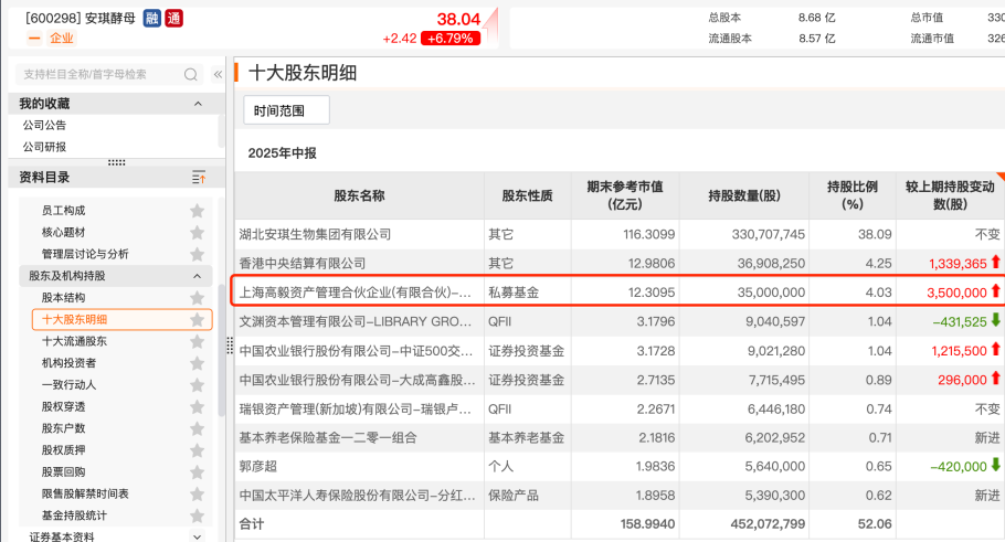 安琪酵母(600298)(600298)发布半年报显示,二季度高毅资产知名基金经理冯柳管理的高毅邻山1号远望基金加仓该公司350万股,连续两个季度加仓。而东诚药业(002675)发布的半年报显示,二季度高毅邻山1号远望基金小幅减持该公司。